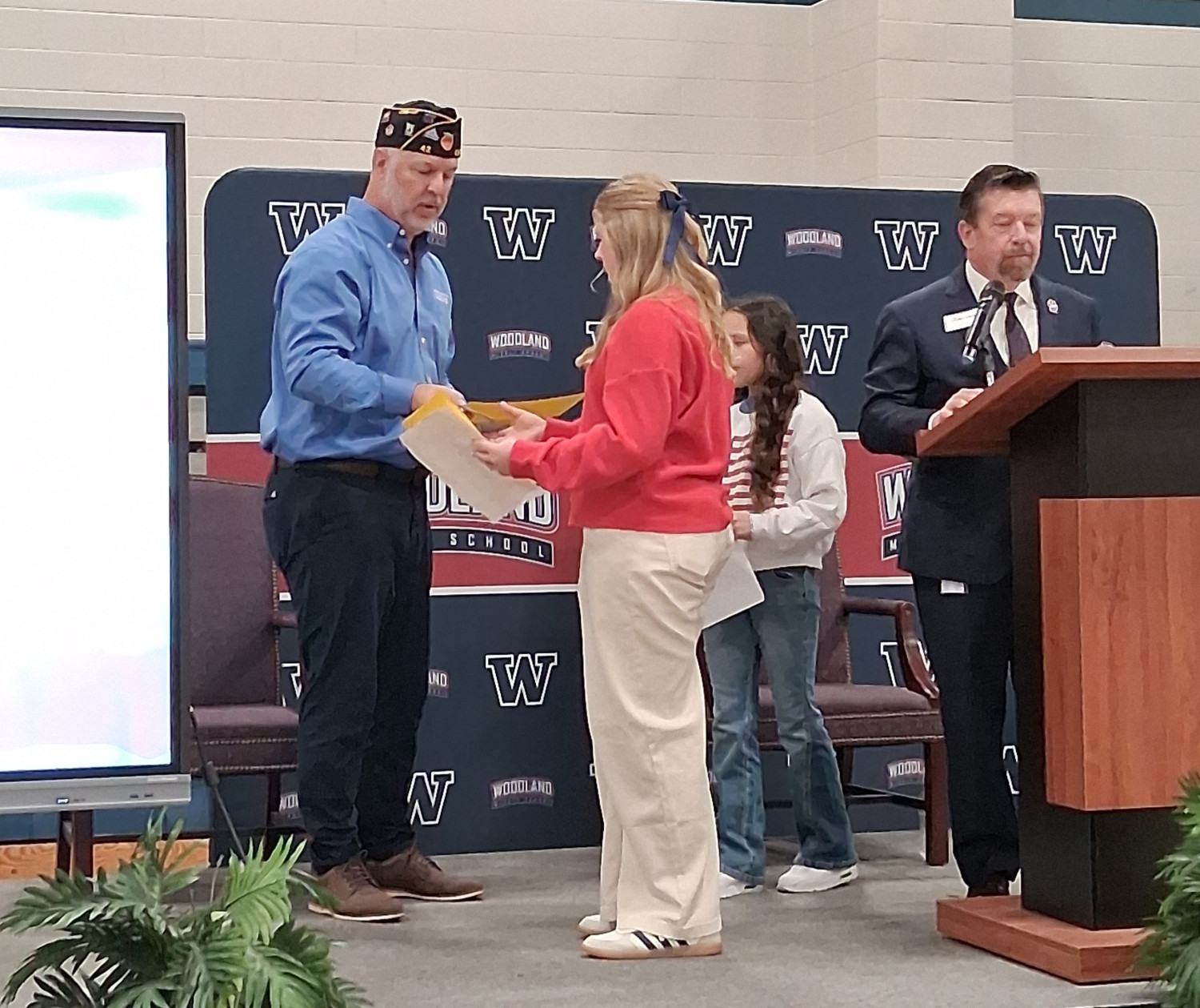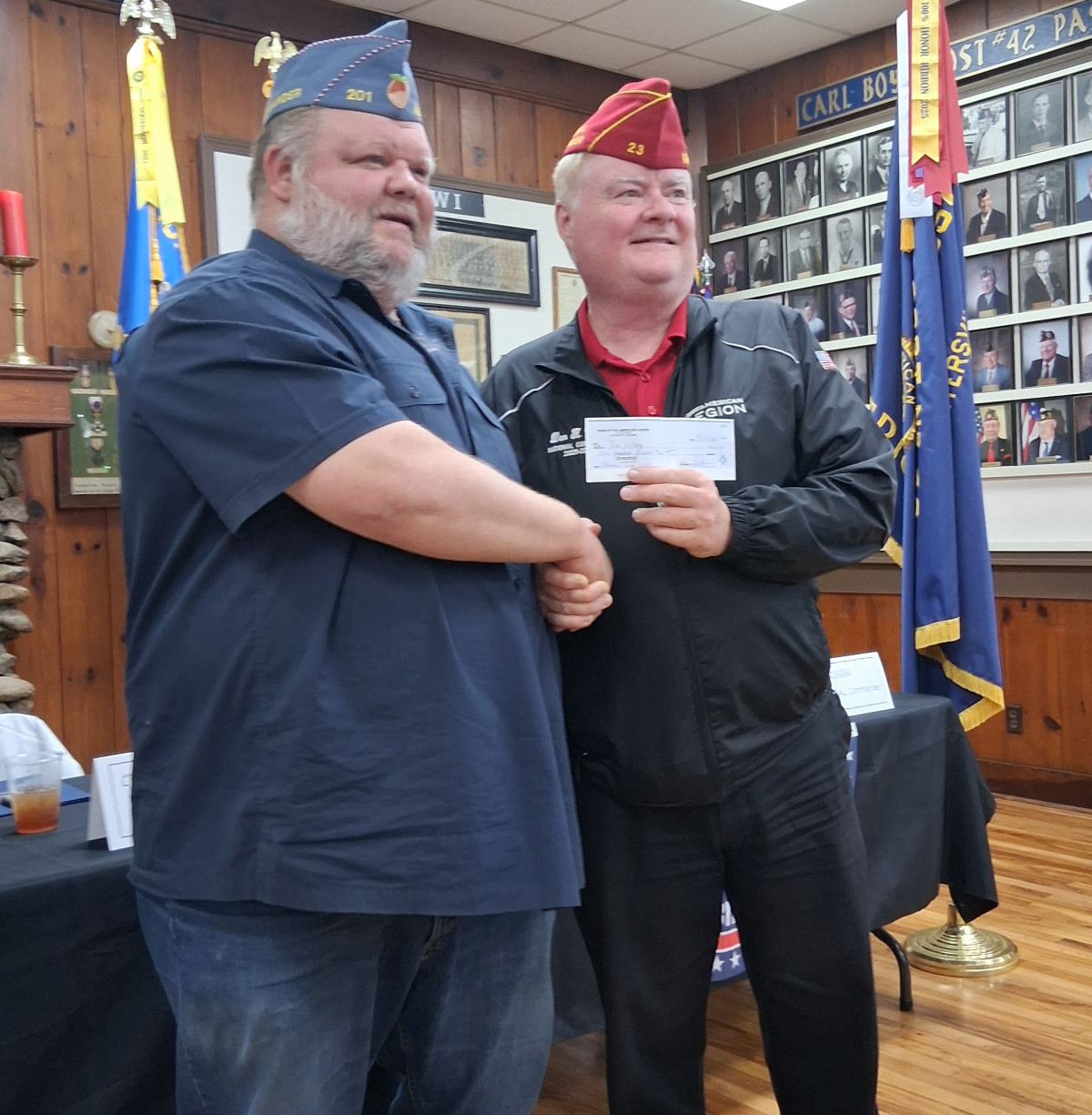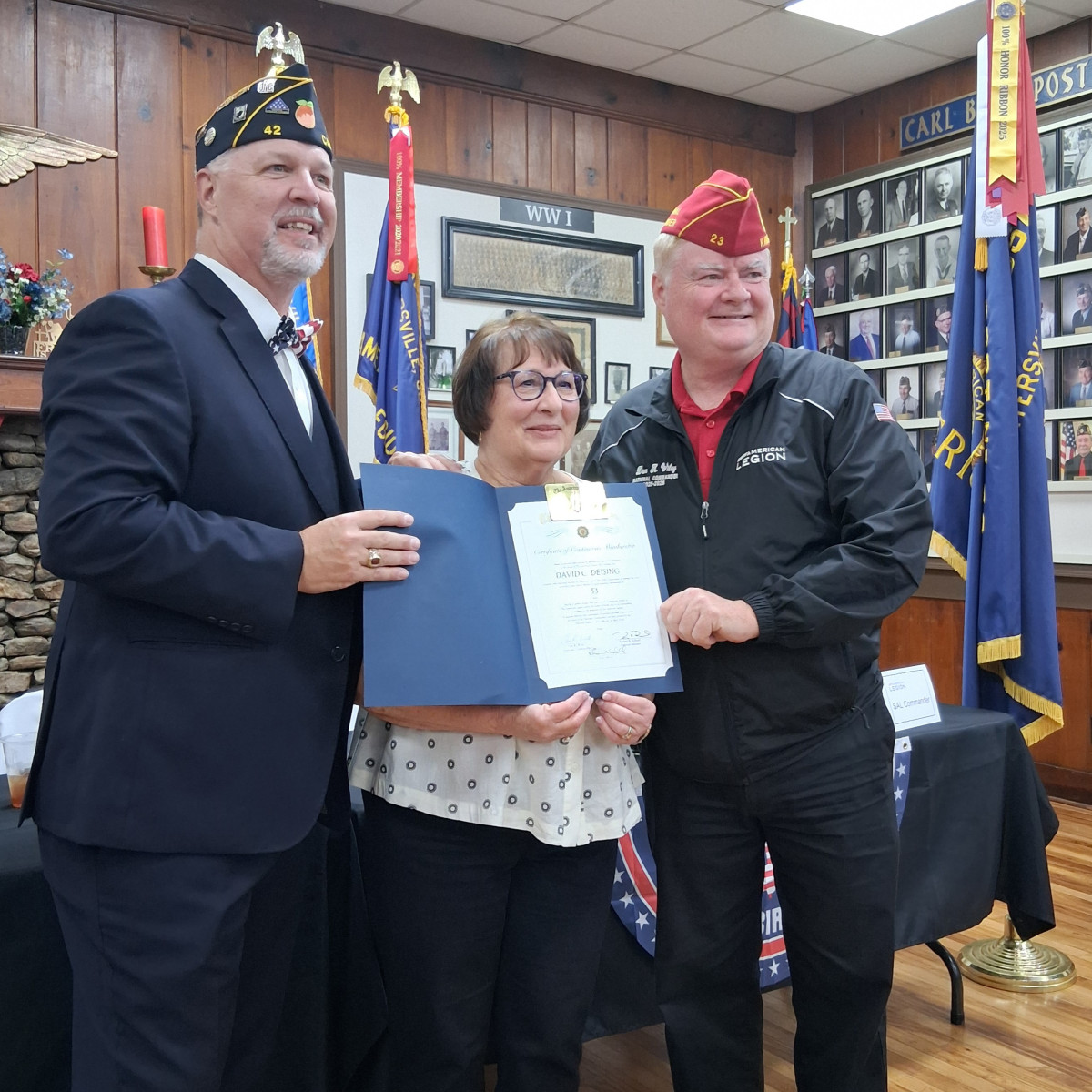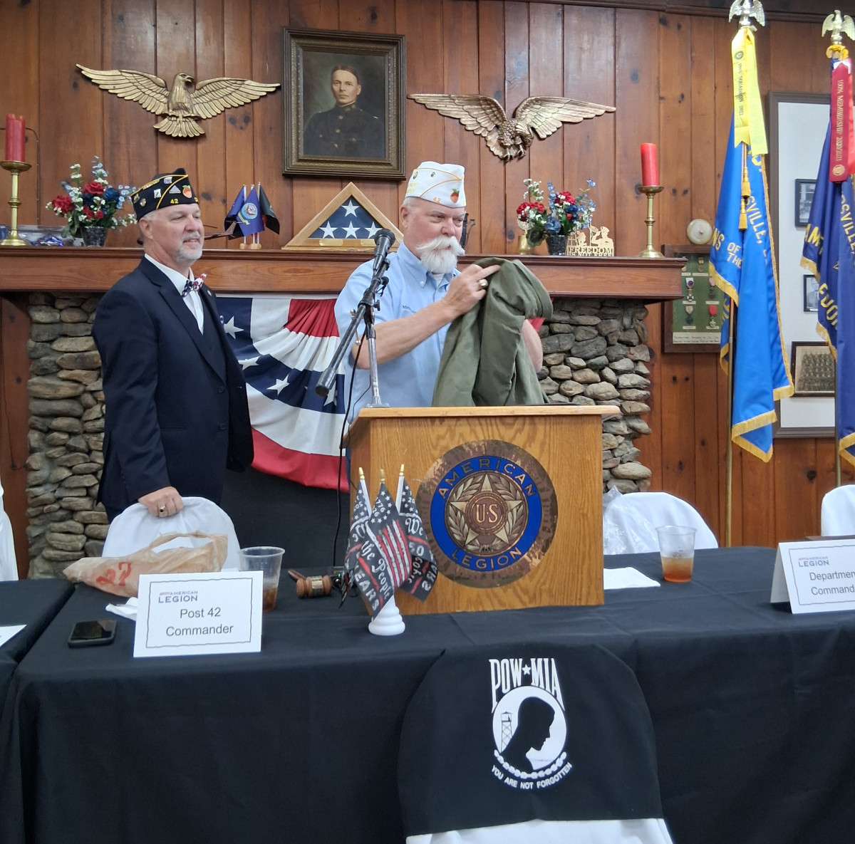At Saturday's District meeting, Department Commander Schwartz presented Post Adjutant Tucker with a flag streamer for achieving 100% Post membership for 2024-2025