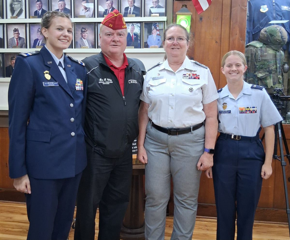 Commander Woodall presents a $1000 check to Civil Air Patrol GA Squadron 129 during August's post meeting