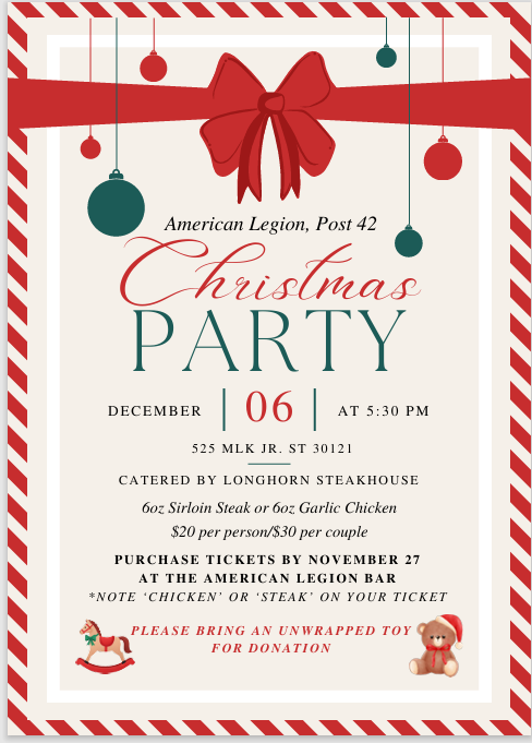To the wonderful patriotic citizens of Bartow/Cartersville area. Join our Post as a Booster or Sponsor. (click Sponsor or Booster Button for details). 100% of the monies raised are given back to the community. Help us to continue sponsoring Scholarships for our children; give aid and assistance to our local needy Veterans, and their families. Help us to continue to support financially worthy community programs and projects.