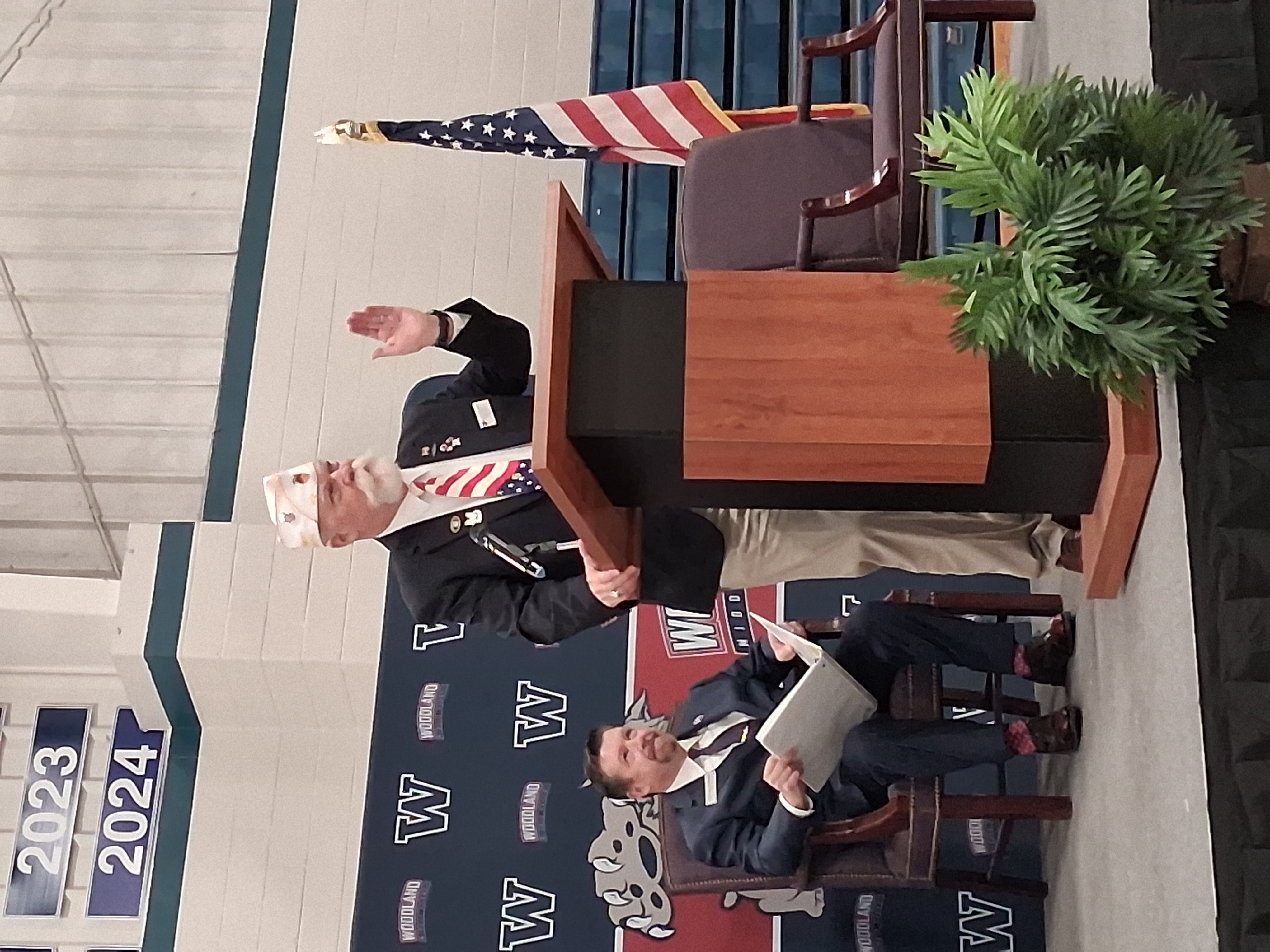 At Saturday's District meeting, Department Commander Schwartz presented Post Adjutant Tucker with a flag streamer for achieving 100% Post membership for 2024-2025