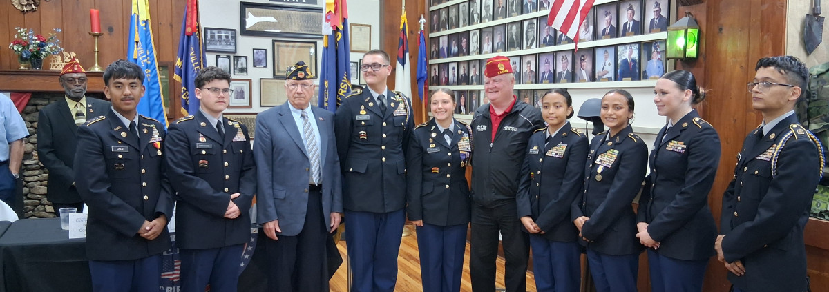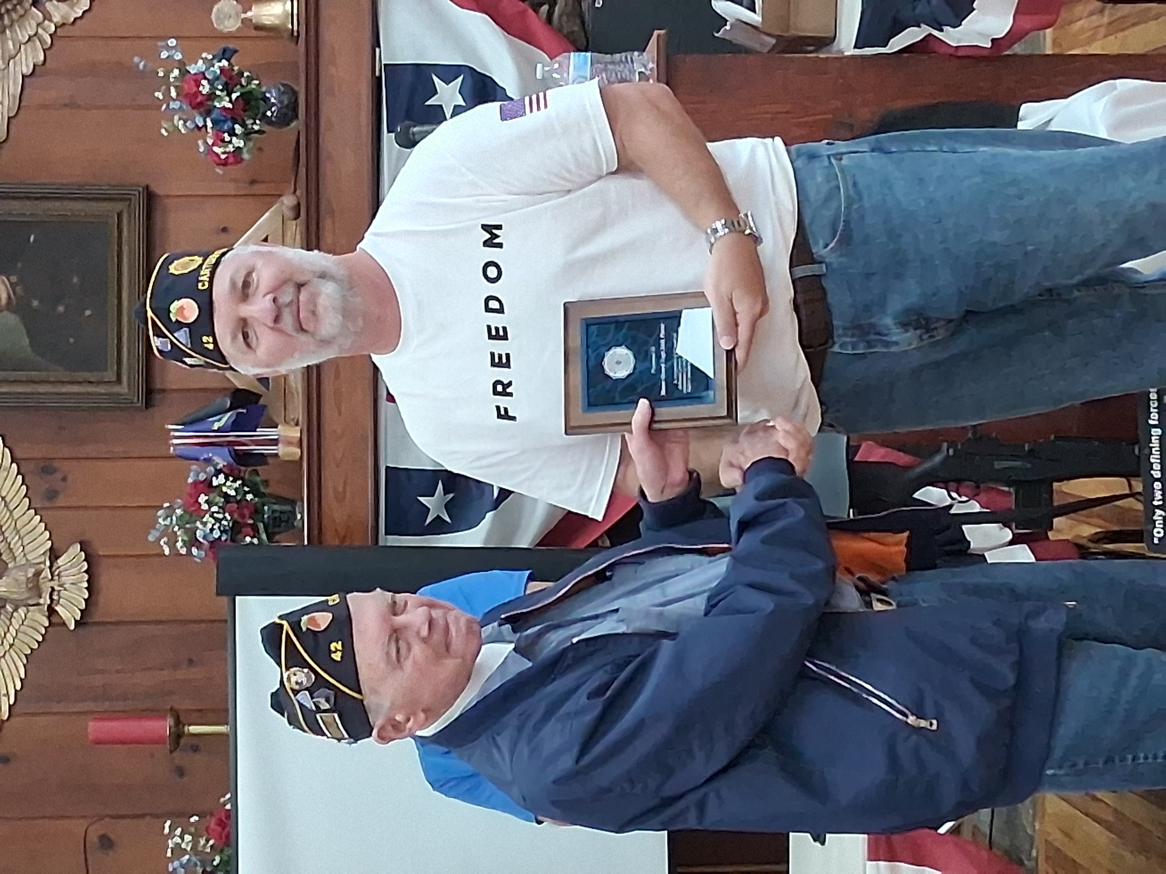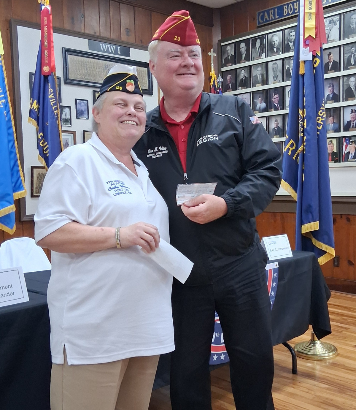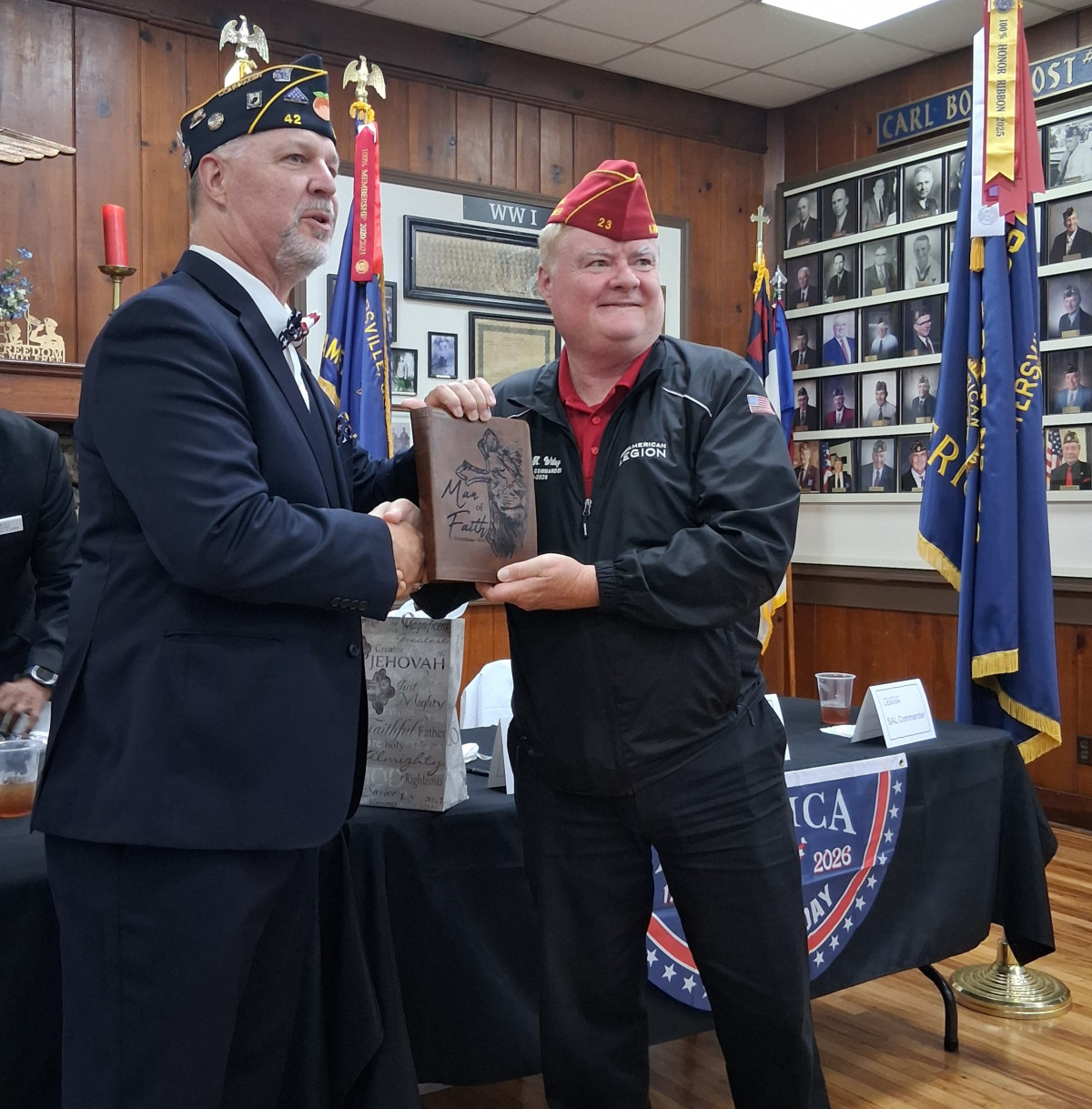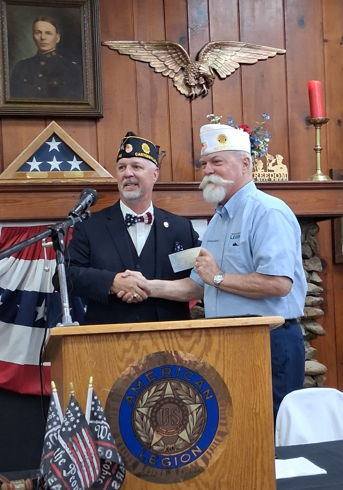 At Saturday's District meeting, Department Commander Schwartz presented Post Adjutant Tucker with a flag streamer for achieving 100% Post membership for 2024-2025