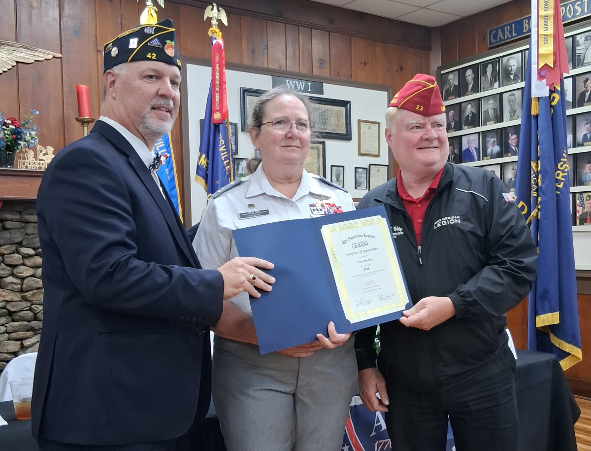 Cmdr Woodall awards Kris Dittrich Post Legionnaire of the Year.