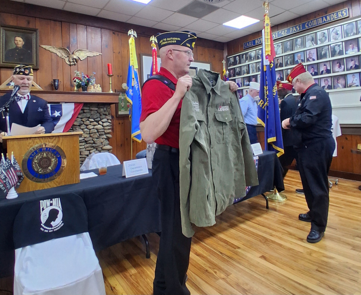 It was an evening of Legion dignitaries, good food, playful banter, awards, and camaraderie. National Commander, Dan Wiley, along with Georgia State Commander Michael Schwartz, arrived at Post 42, via Bartow Sheriff police escot at 1800hrs on 4/24/2026. Upon arrival, Cmdr Wiley was honored with a 14-saber arch, courtesy of the Cass High School JROTC cadets. The commander was then greeted by Senior Vice Tullar whom provided him with a Post grounds tour in our HUMVEE. The baquet then kicked off with the National Commander entering and individually greeting and shaking hands with each and every attendee in the meeting hall. An exquisite meal was catered by Coy Stewart of Burning Butts BBQ and served by our ladies of the Post 42 Auxiliary. The festivity culminated with gifts presented to the National Commander of a personalized engraved Bible from Post Cmdr Woodall, and personalized embroidered jackets from GA State Cmdr Schwartz. Awards were presented. First, to our longest standing post member, Chris Deising, excepted on behalf of his wife, Kay Deising. Then, to our Cass High JROTC commander, 1SGT James Hornback, for the exceptional work he does with the JROTC program, and next to Squadron Cmdr Gina Rhoden of the Bartow-Etowah Cadets Squadron Civil Air Patrol for the exceptional work she does with our youth in that organization. Post Cmdr Woodall presented a $1000 check to National Cmdr Wiley for the Veterans and Childrens Foundation as well as a $1000 check to State Cmdr Schwartz for the Georgia Veterans Fund. Other checks were presented to the National Commander from District 7 Adjutant Cathy Herrera and the Sons of the American Legion.